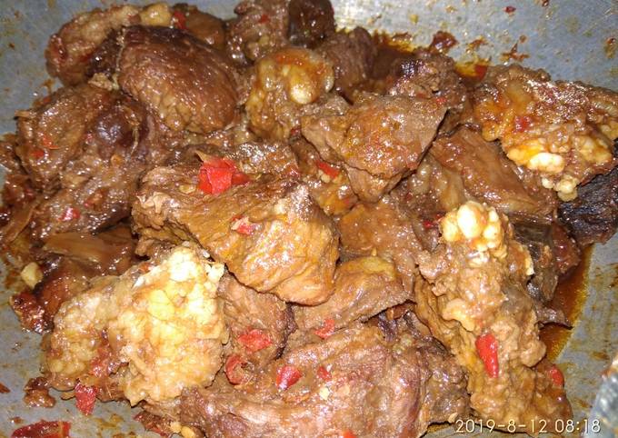 Lumuri daging sapi dengan bumbu halus, bango kecap manis, ketumbar bubuk, minyak, dan air asam jawa. Aduk bumbu halus dengan kecap manis, air jeruk dan minyak sayur hingga rata. Haluskan bawang putih, bawang merah, cabai merah, kemiri, terasi, irisan gula jawa, dan lengkuas lalu tumis. Kedua, iris tipis daging agar bumbu lebih cepat meresap. Langkah selanjutnya yaitu tumislah bumbu halus dengan sedikit minyak hingga wangi, setelah wangi masukkan santan, tambahkan gula merah serta daun jeruk.